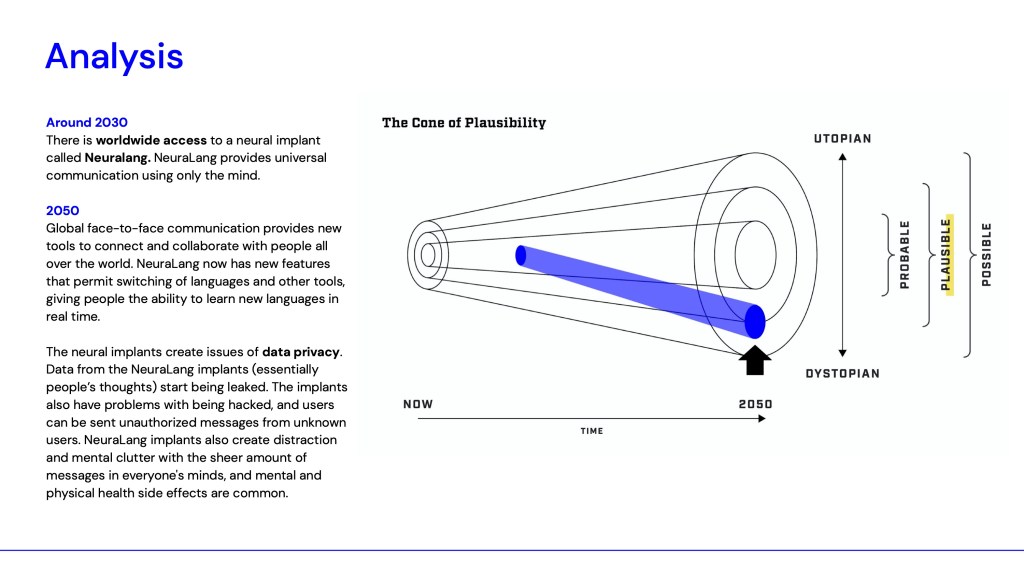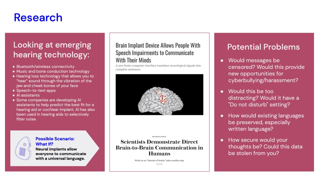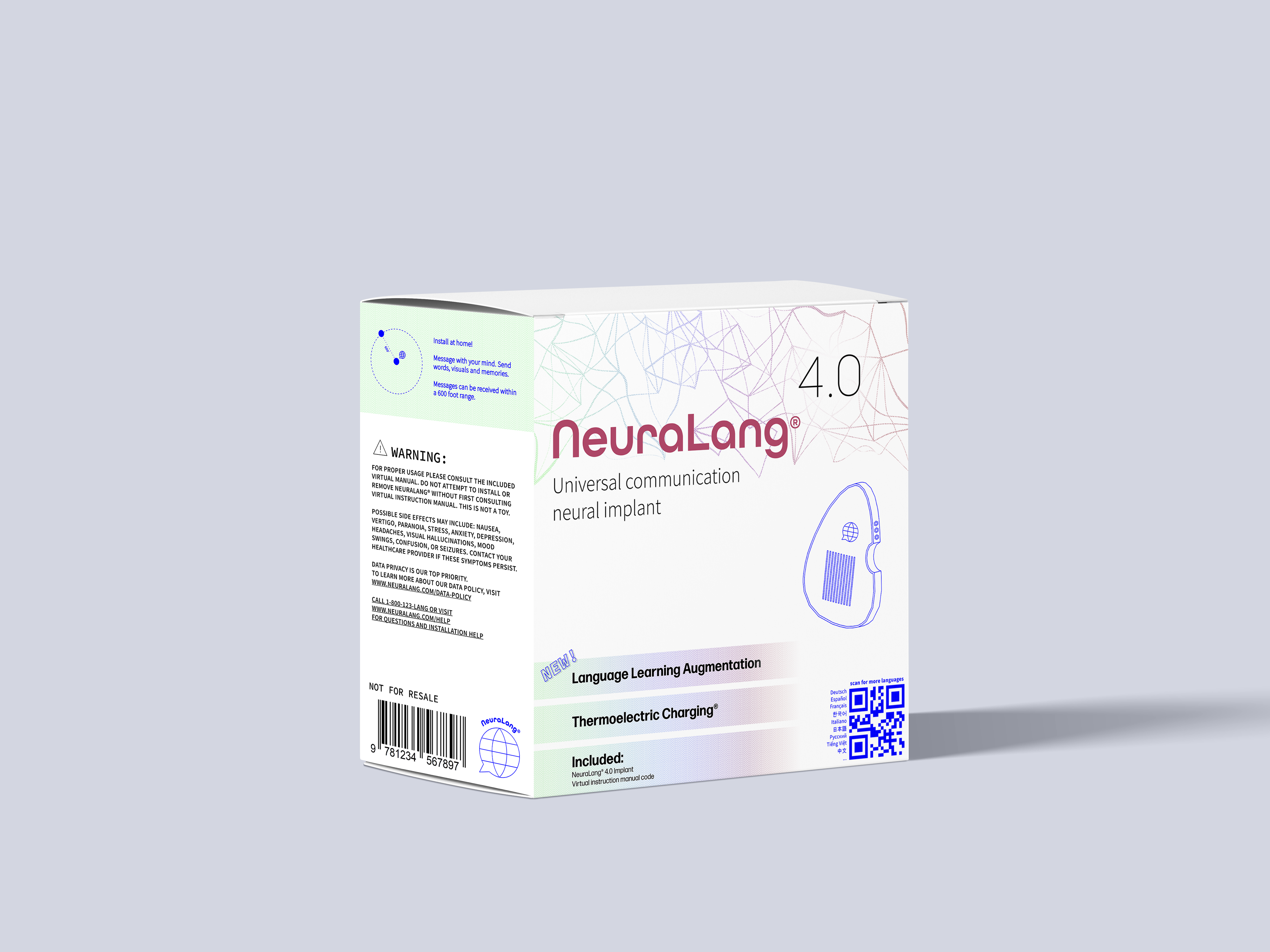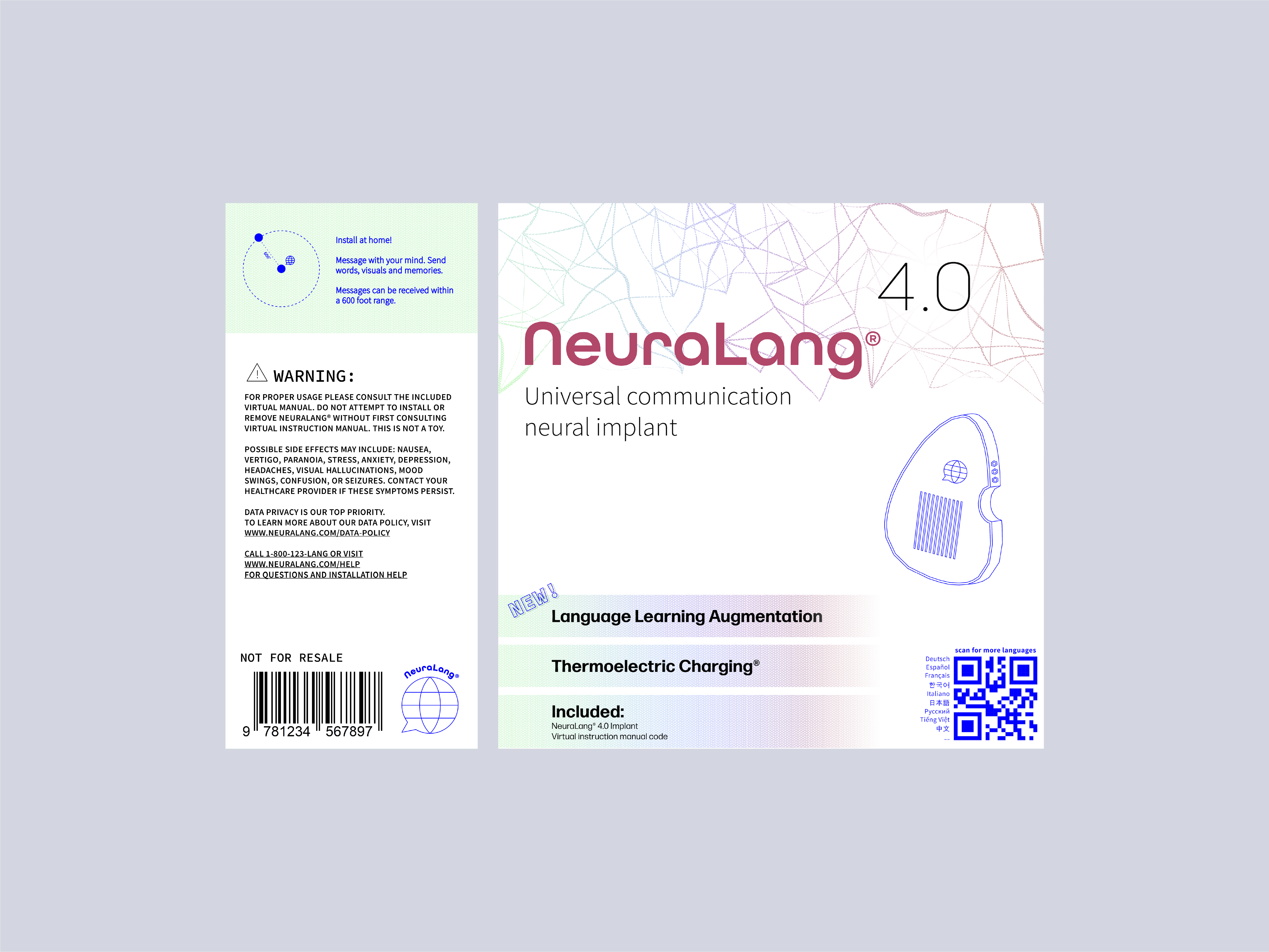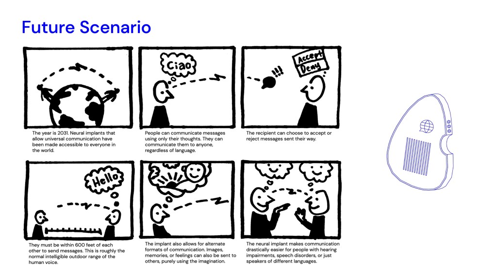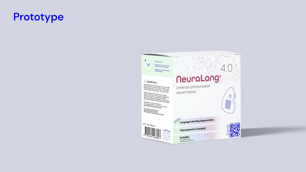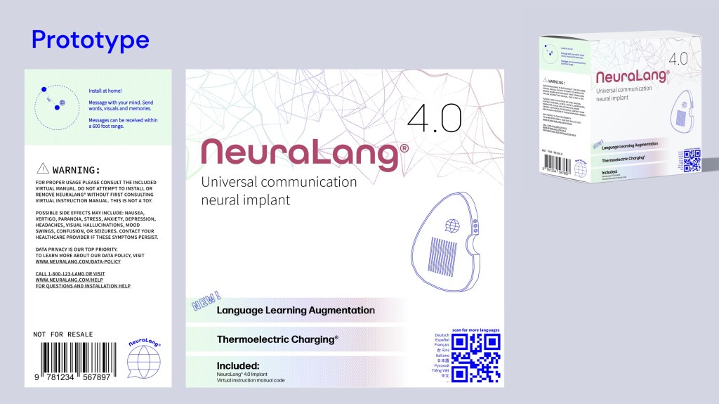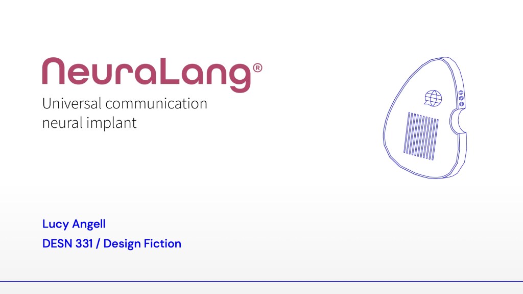 I CREATED NEURALANG: A NEURAL IMPLANT ACCESSIBLE WORLDWIDE THAT PROVIDES UNIVERSAL COMMUNICATION USING ONLY THE MIND.I WANTED THE PRODUCT TO BE PHARMACEUTICAL IN DESIGN, BECAUSE IT WOULD BE ACCESSED IN THE SAME STORES YOU MIGHT BUY YOUR VITAMINS.